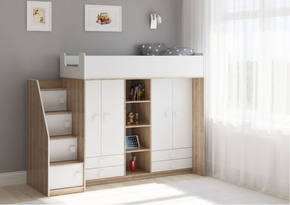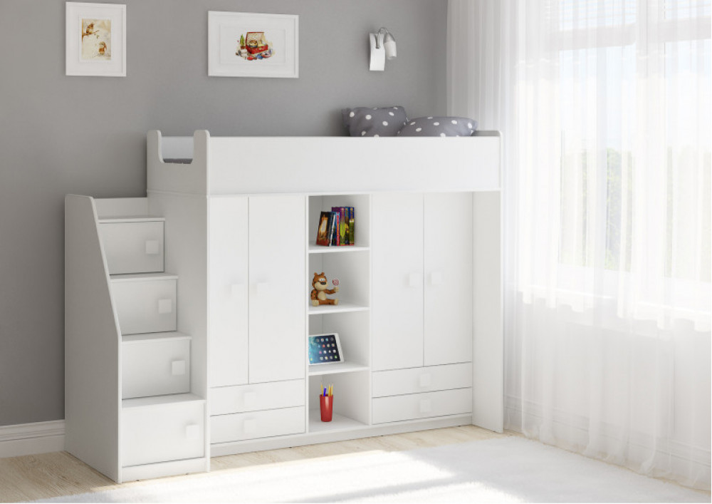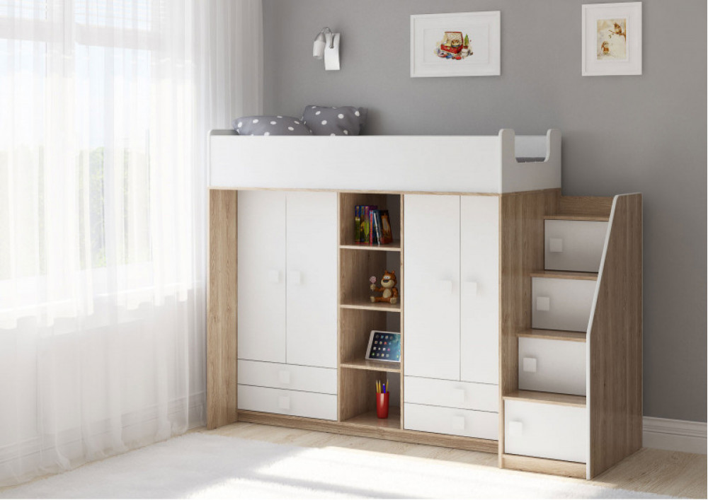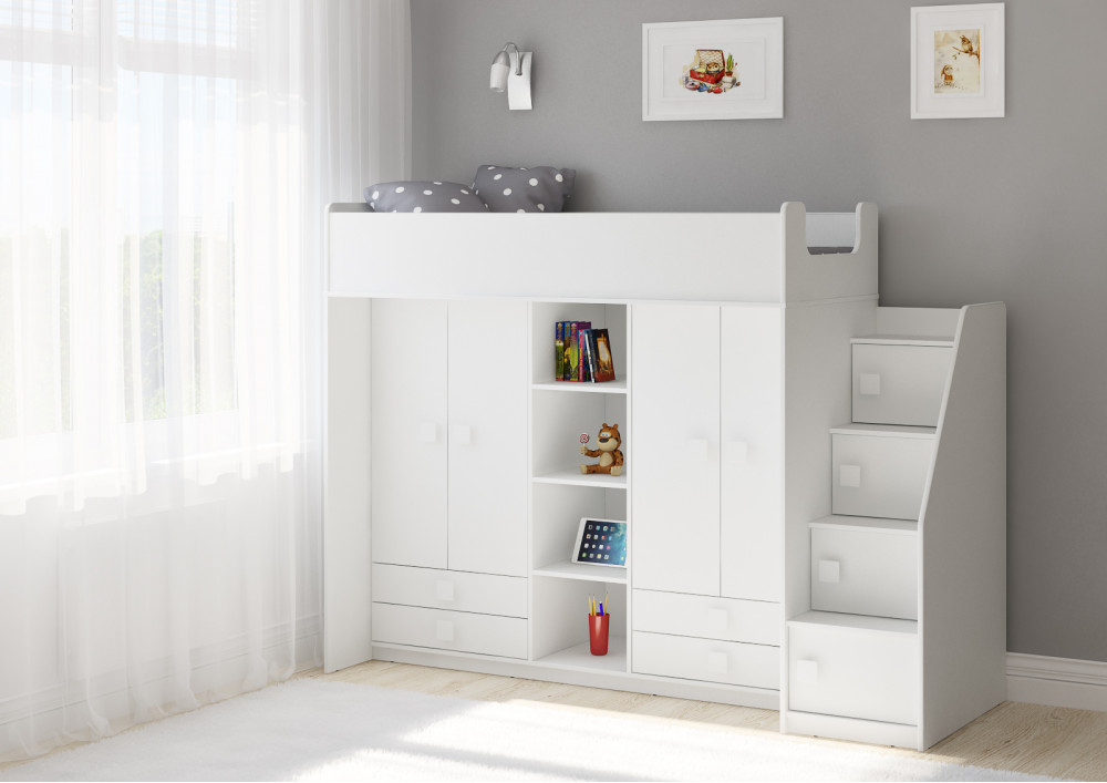 Под спальным местом располагаются два вместительных шкафа и стеллаж между ними для хранения одежды, белья,игрушек или иных вещей.Внизу шкафа располагаются выкатные ящики,в которых можно хранить отдельно мелкие предметы.Расположение ящиков позволяет ребенку легко извлекать необходимые вещи самостоятельно.